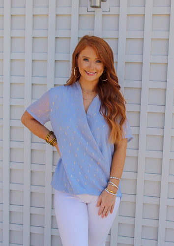 Tiffany Short Sleeve Foil Blouse- Dusty Blue