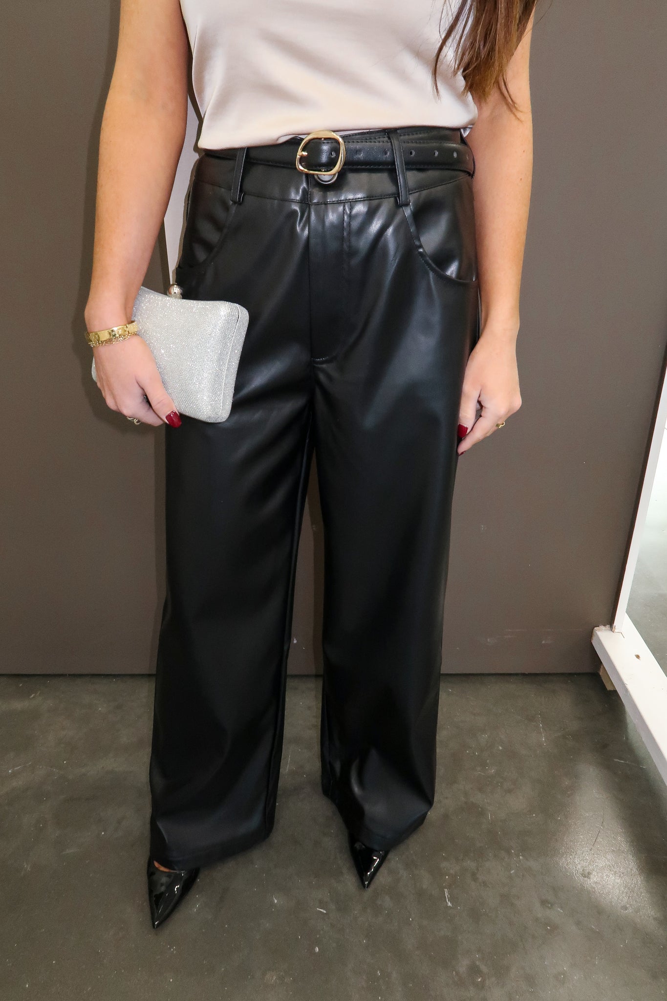 Elevate your evening wardrobe with these glossy faux leather wide-leg pants—a timeless essential that transitions effortlessly from dinner to night out. The sleek, lustrous finish catches the light beautifully, while the relaxed wide-leg silhouette offers both comfort and contemporary style. Pair with heels for an polished look or boots for edge. A versatile piece you'll reach for again and again.
