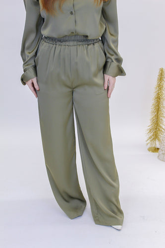 In Office Wide Leg Satin Pants- Olive![]()  - Regular price