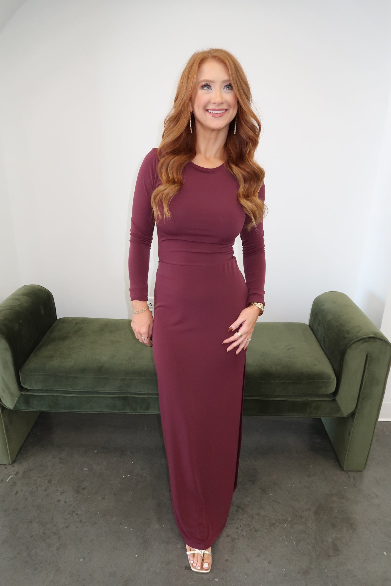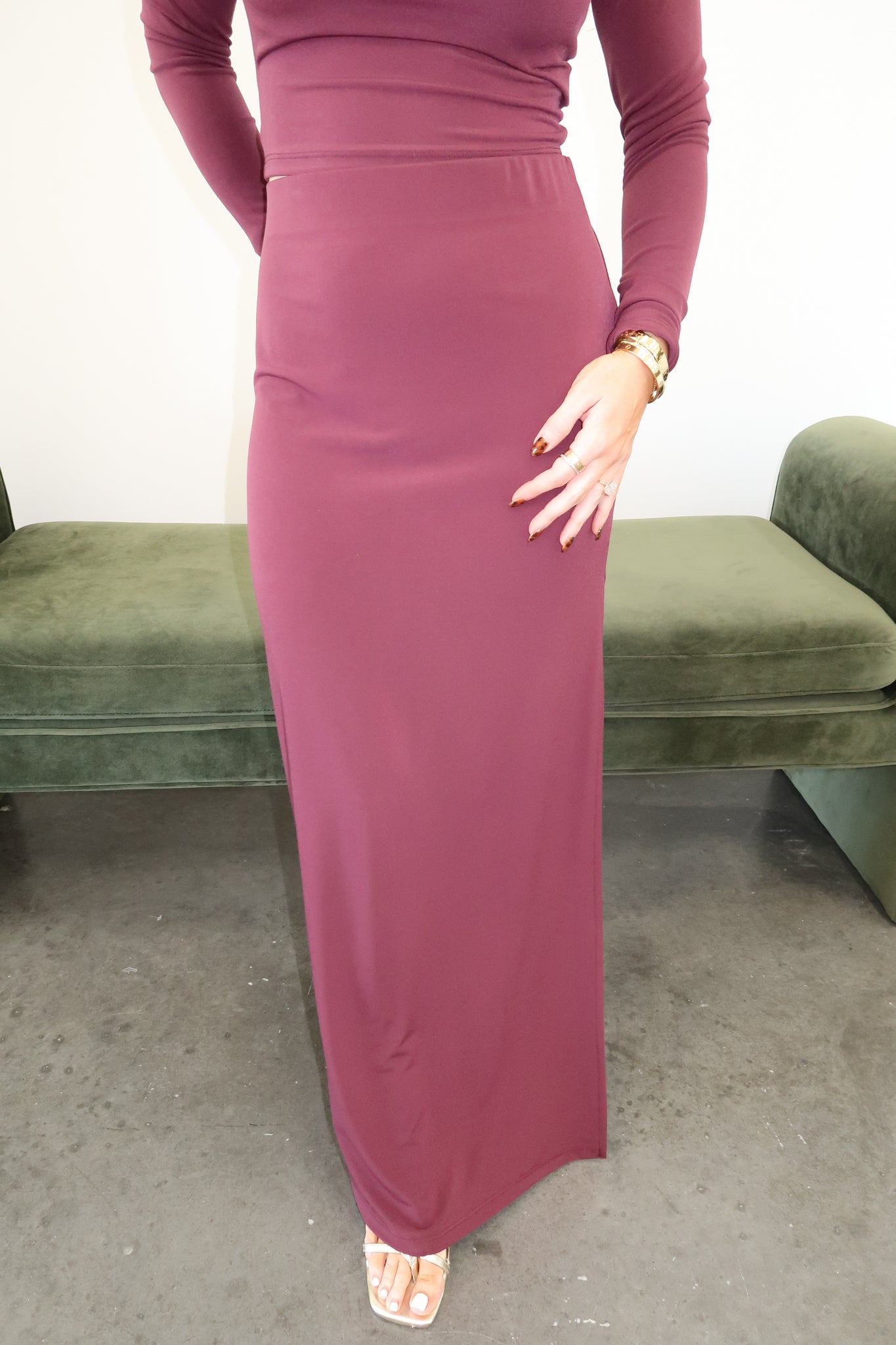 Elevate your seasonal wardrobe with this striking two-piece set featuring a refined top paired with a flowing maxi skirt in rich dark cherry. The sophisticated silhouette transitions seamlessly from holiday gatherings to evening outings, offering versatile styling options whether you choose boots for an edgy look or heels for polished elegance. A timeless investment piece that captures contemporary style while maintaining understated luxury.
