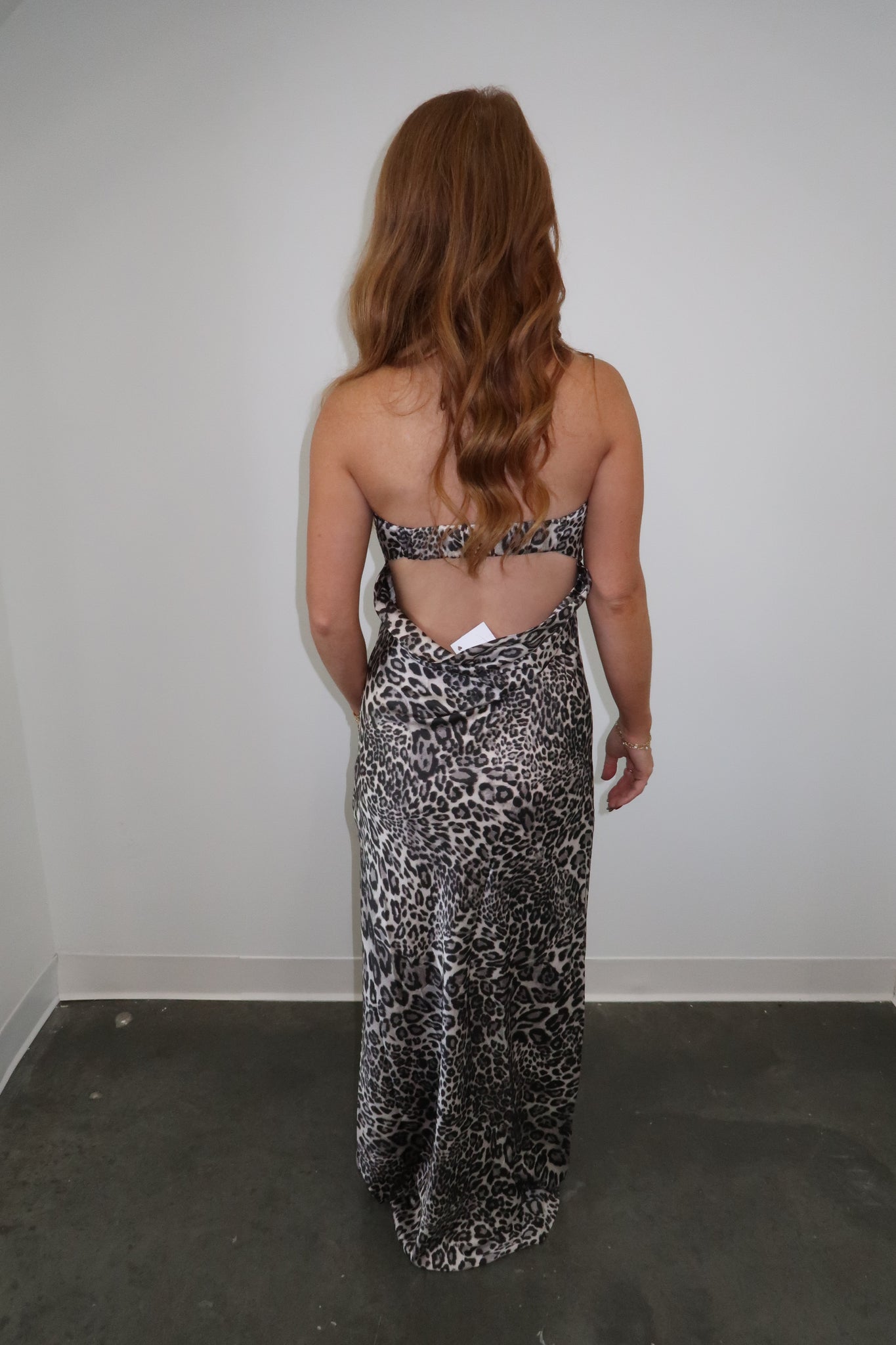 Make a bold statement in this striking strapless maxi dress, featuring a captivating leopard print that commands attention. The elegant silhouette flows gracefully to the floor, creating an effortlessly chic look perfect for formal events and upscale occasions. Pair with heels to complete your sophisticated ensemble and let your confident, daring side shine through.
