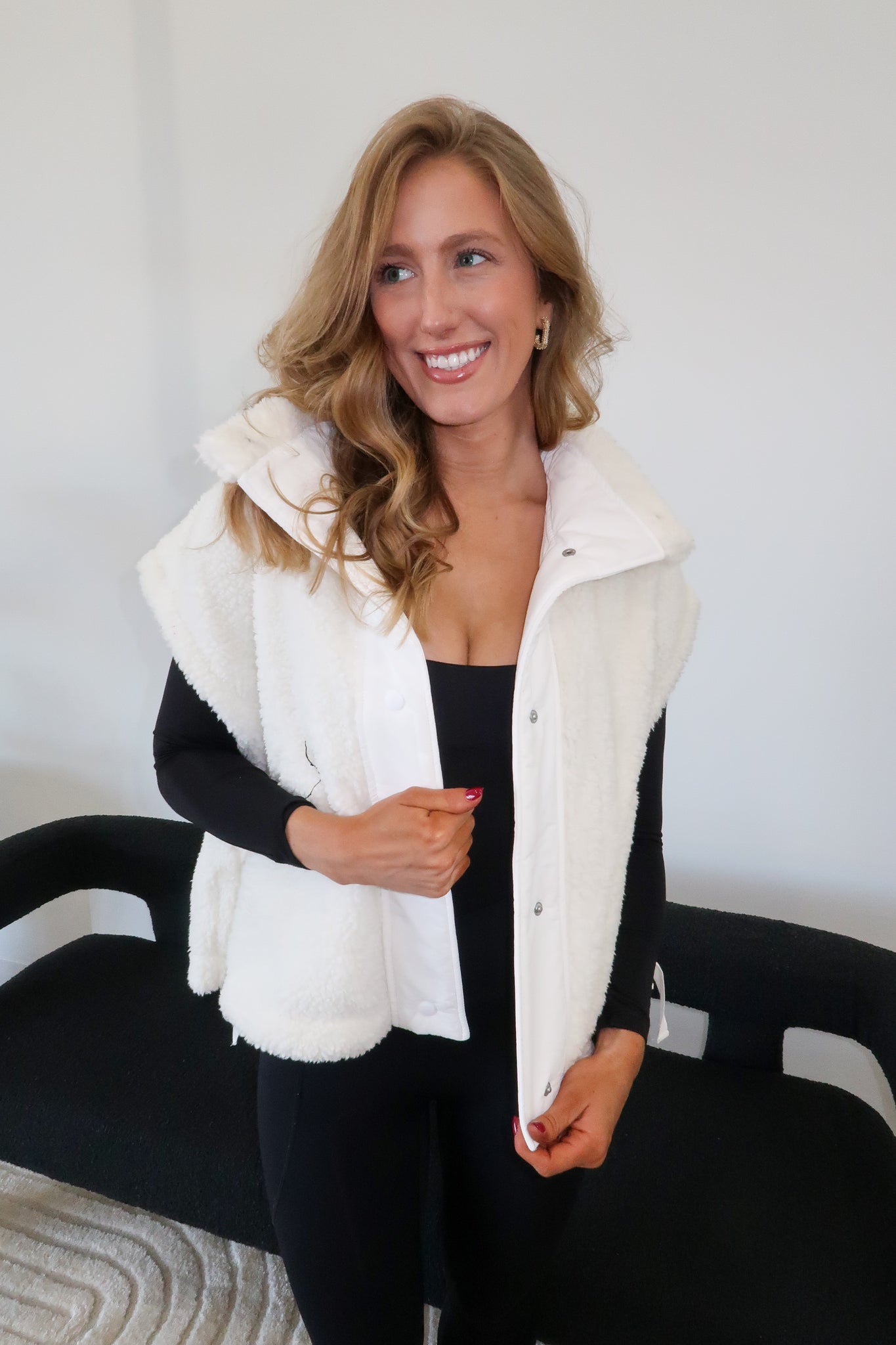 The Cozy Sherpa Vest Jacket in white is an essential layering piece that transcends seasons. Its plush sherpa construction provides warmth without bulk, making it the perfect companion to leggings or jeans for those crisp days when you need an extra layer. Versatile enough to reach for year after year, this timeless vest effortlessly elevates any casual ensemble while delivering the comfort and coziness you'll return to again and again.