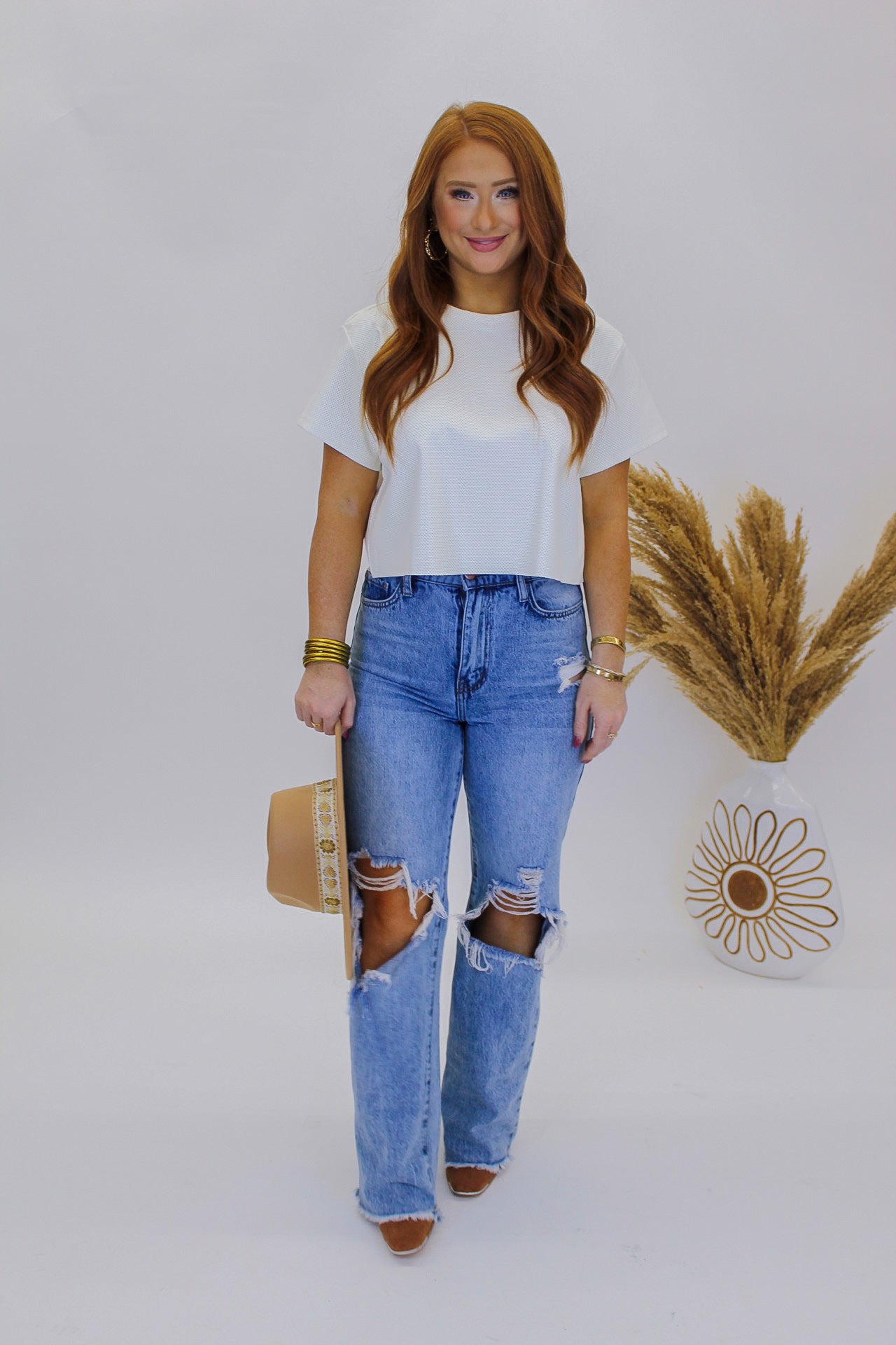 This top is one you will want to carry into fall! Pair with your favorite pair of denim and you are ready for the day! Would be super cute pair with a skirt or shorts!