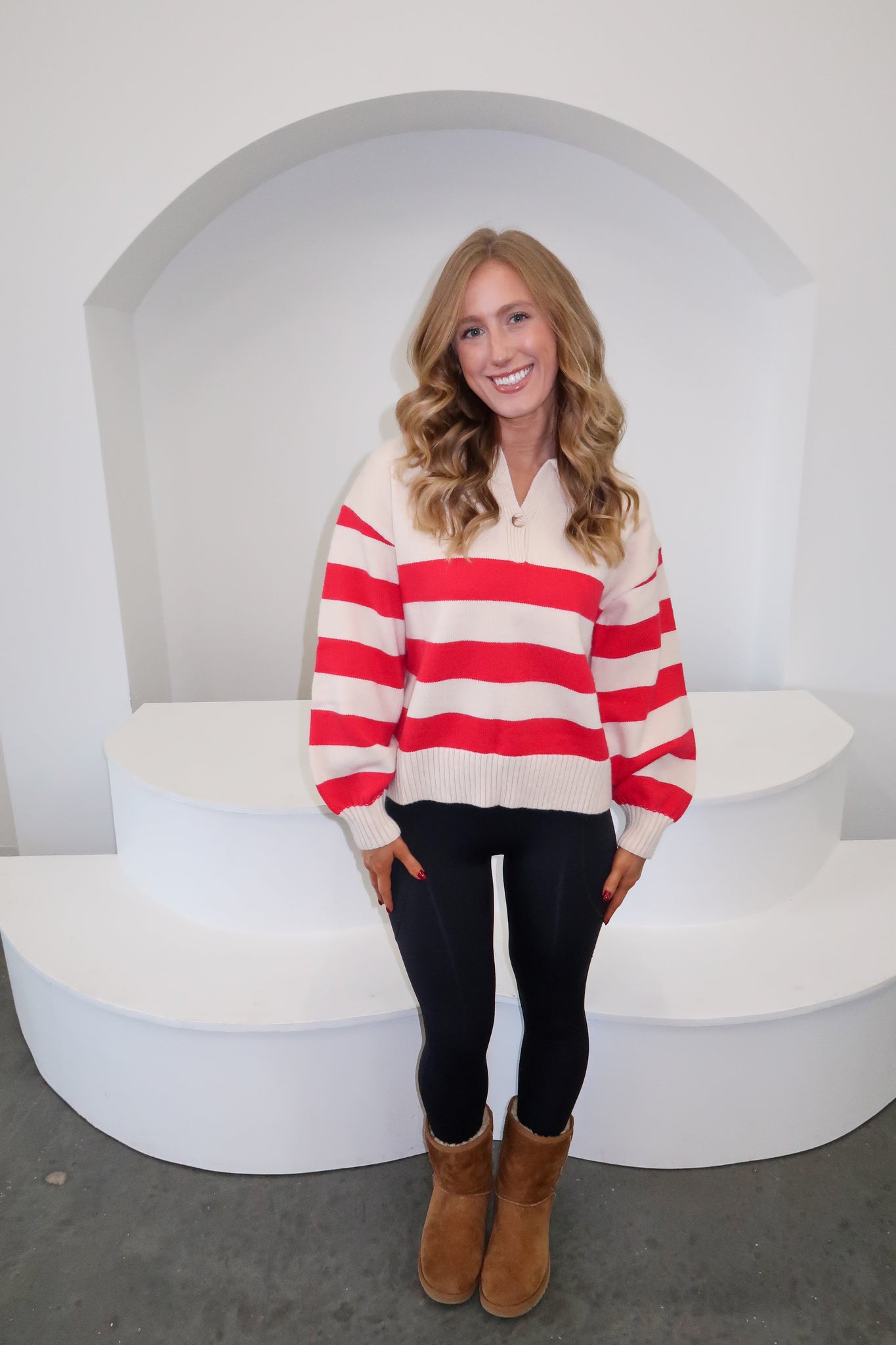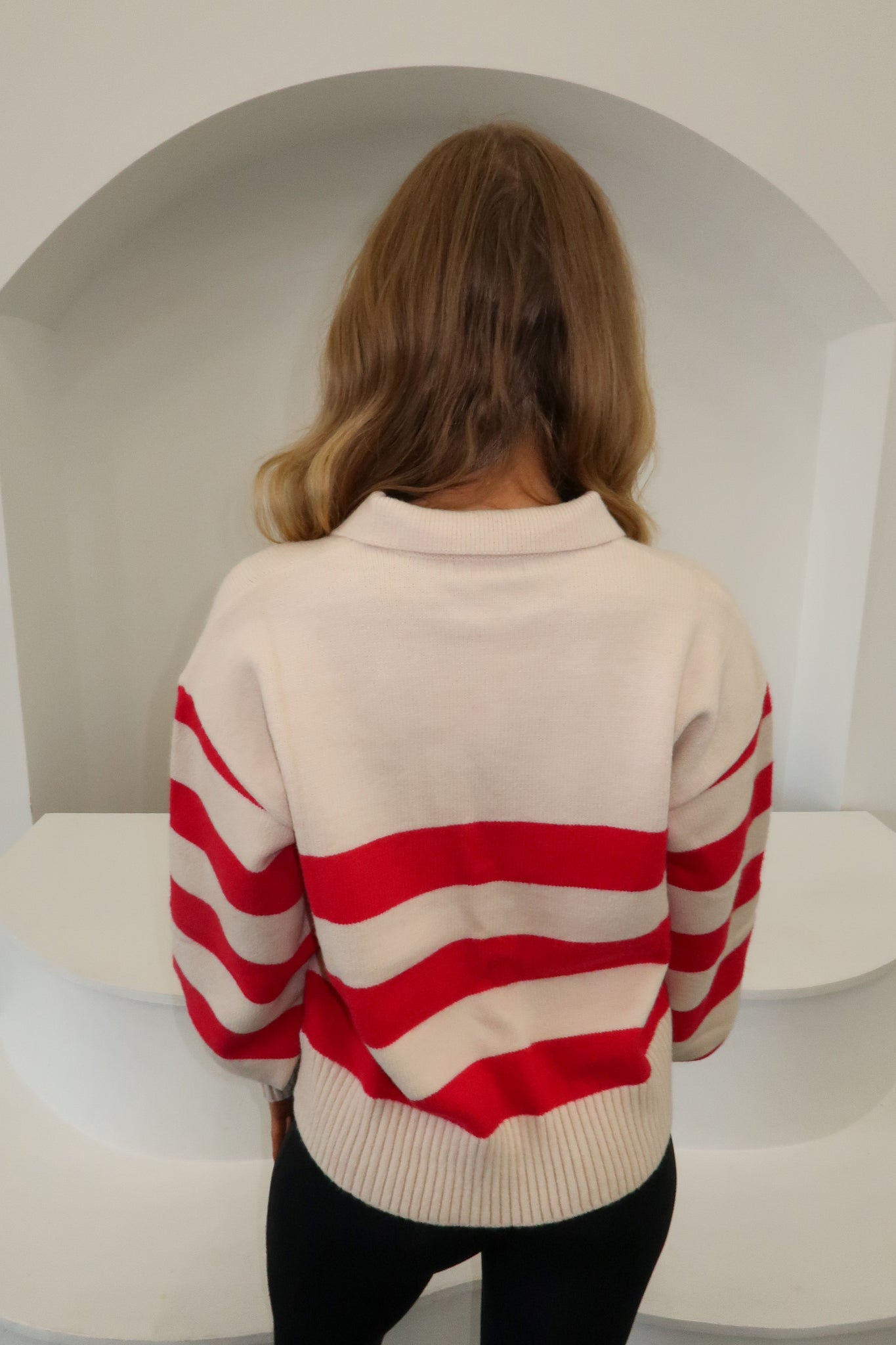 Elevate your everyday wardrobe with this refined striped polo collar knit sweater. The classic horizontal stripes and structured collar create a polished silhouette that transitions effortlessly from casual to put-together. Layer it over your favorite jeans for weekend ease or pair with leggings for a comfortable yet chic ensemble. Perfect for those moments when you want to feel both relaxed and intentional about your style.