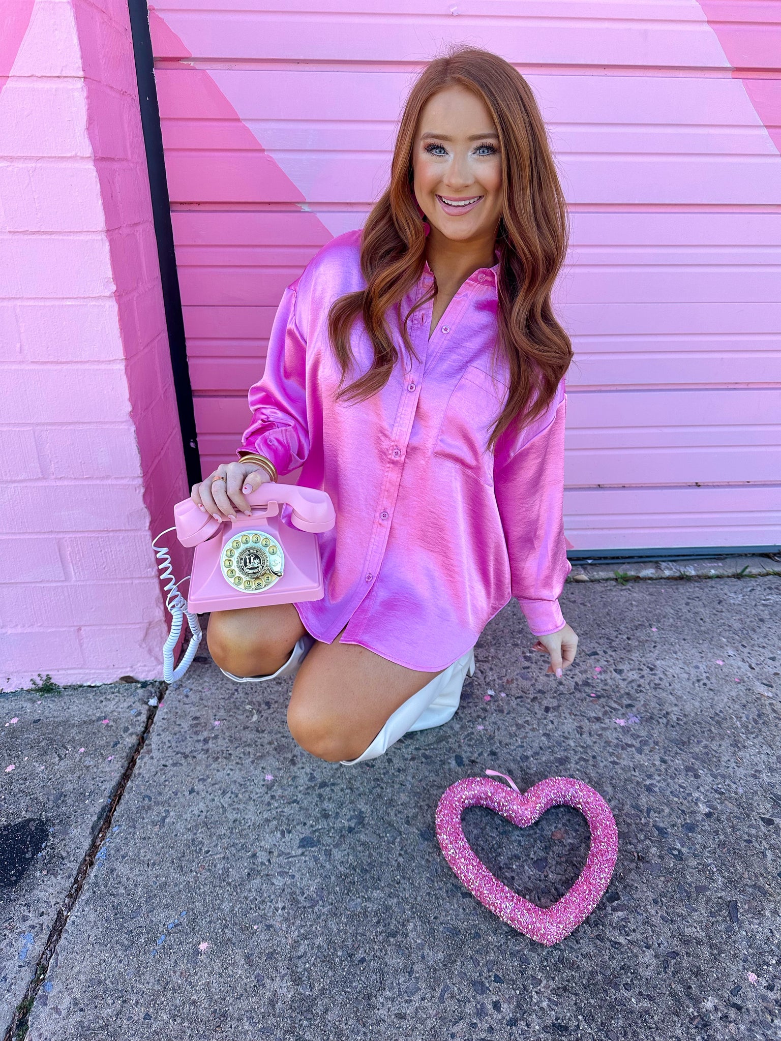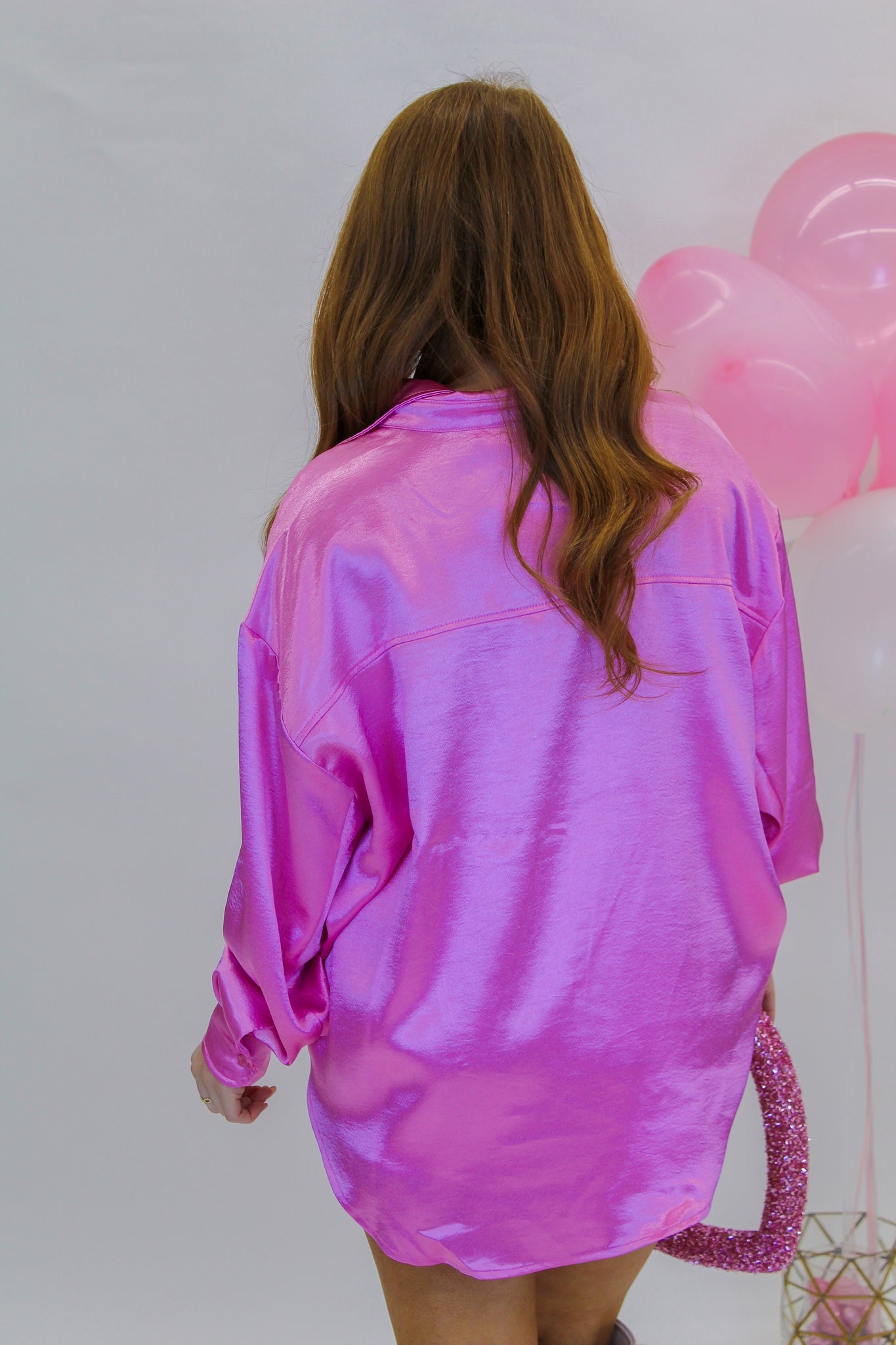 • Load image into Gallery viewer, Busy Babe Oversized Satin Button Down- Pink