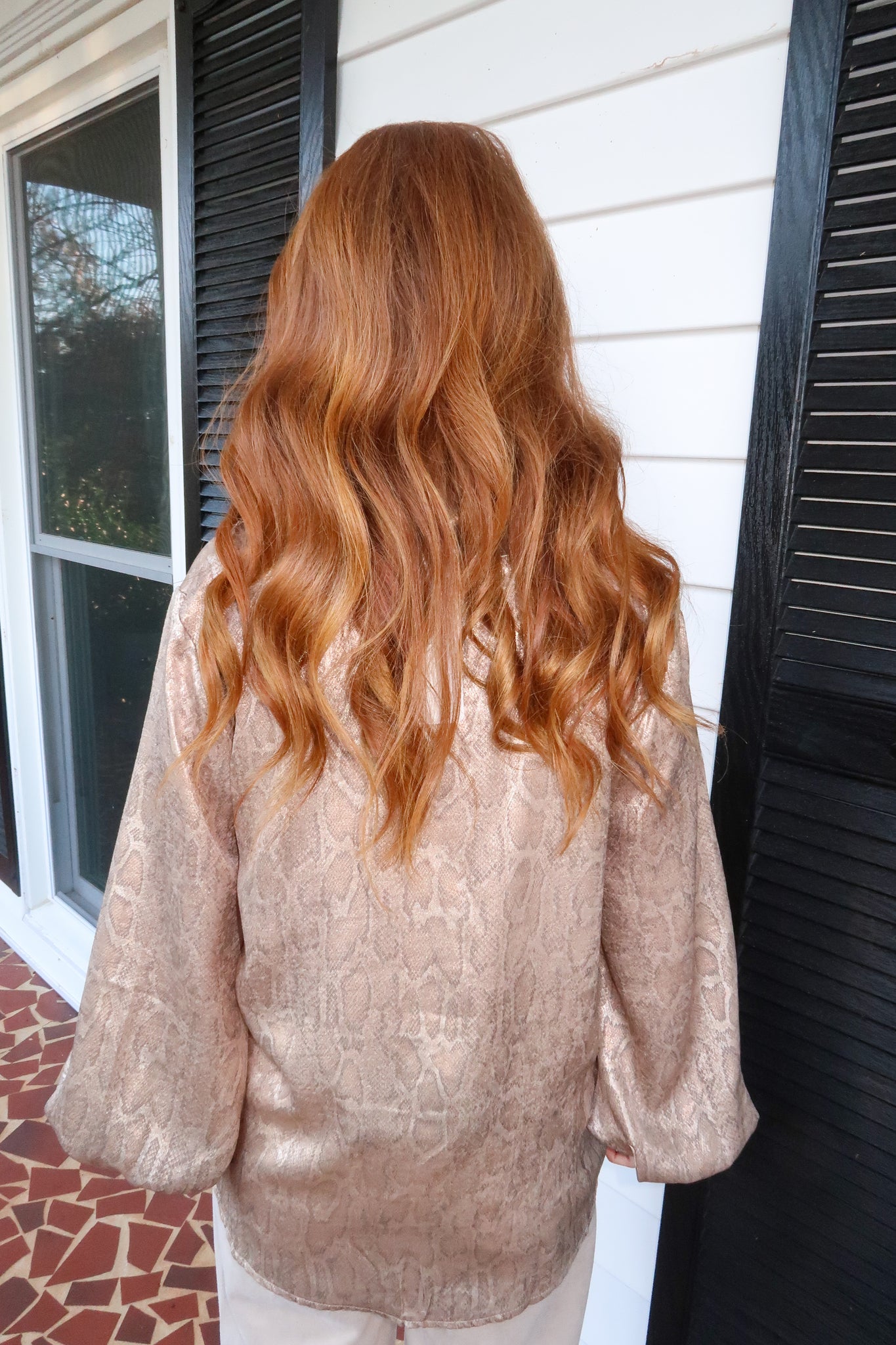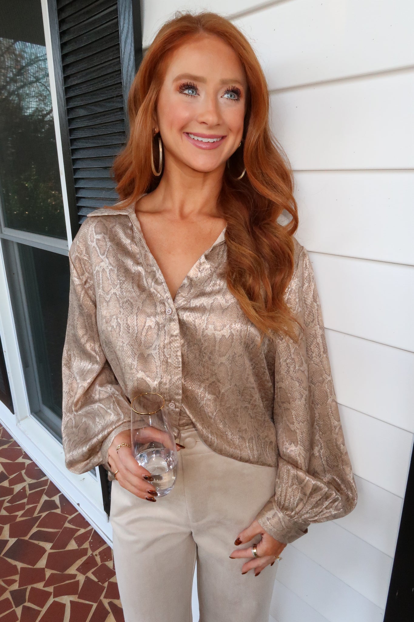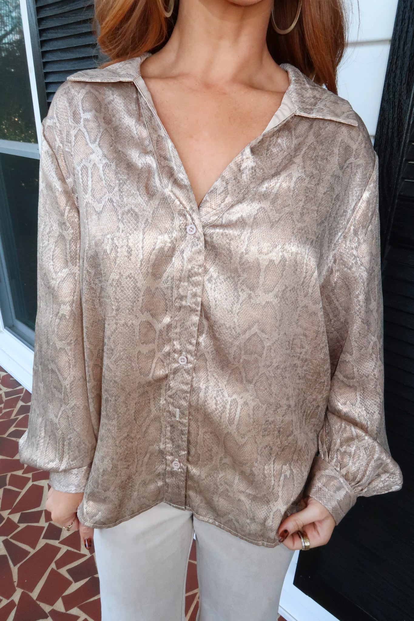 Elevate your wardrobe with this sophisticated snakeskin button-up top in taupe. The refined texture and polished design make it an ideal choice for professional settings, religious services, or special occasions. Its structured silhouette and classic styling ensure you'll look put-together whether you're navigating the office or attending an event. Versatile enough to pair with tailored trousers or a skirt, this piece brings understated elegance to any occasion.