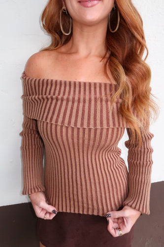 Highlands Off Shoulder Ribbed Top- Brown