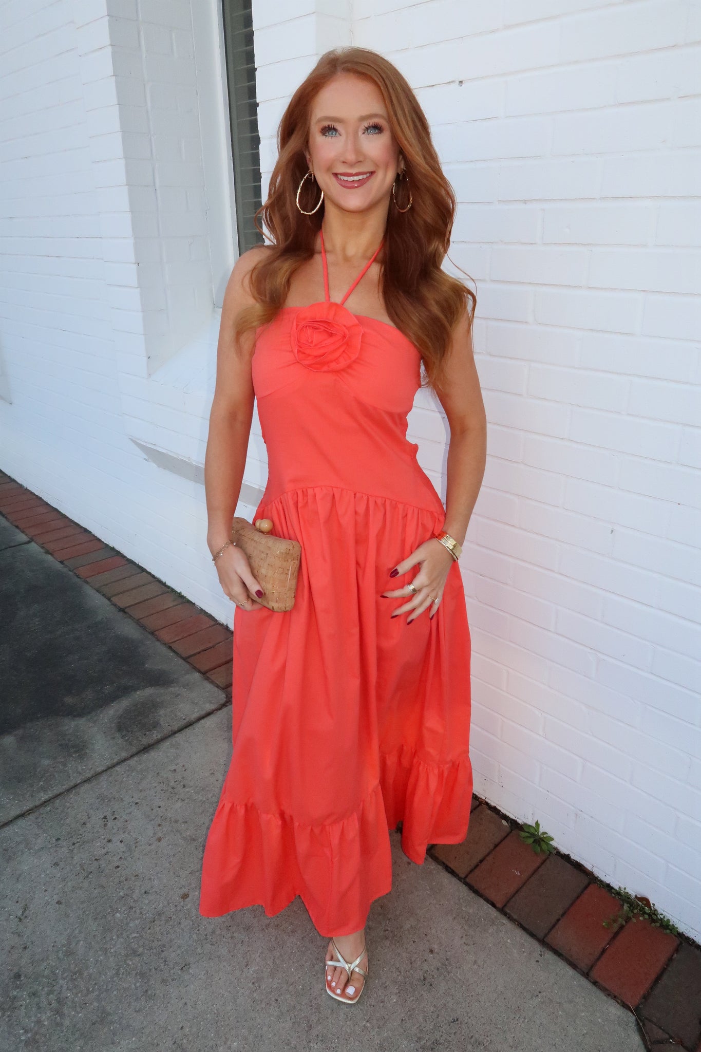 Elevate your warm-weather wardrobe with this striking coral poplin midi dress, featuring a refined halter neckline that commands attention. The vibrant hue brings an instant luminosity to spring and summer days, while the midi silhouette offers timeless elegance. Style it with wedges for polished sophistication or flip-flops for effortless weekend charm. A versatile piece that transitions seamlessly from brunch to evening gatherings.